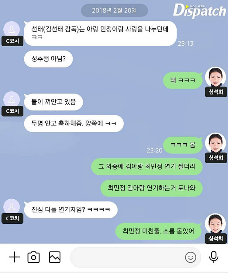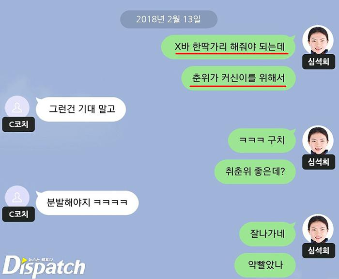 해당 메시지에는 올림픽에 함께 출전한 최민정 김아랑을 헐뜯는 내용이 공개돼 논란이 되고 있다8일 디스패치는 심석희와 쇼트트랙 여자 국가대표 A코치가 나눈 메시지를. 심석희 코치 폭행 사건.